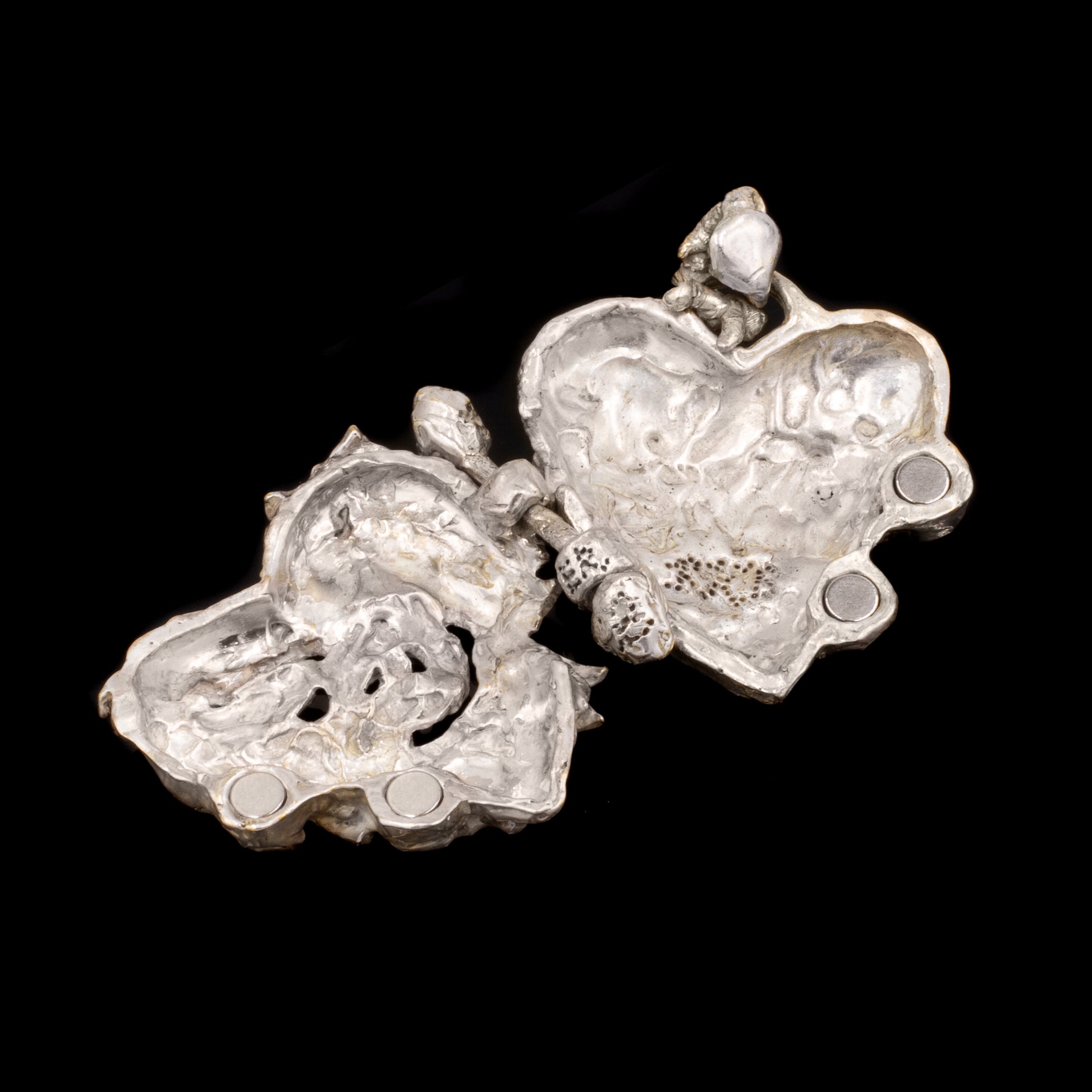 A love heart shaped locket held together through magnetic force. The locket can physically hold and protect something of value, sentimental or physical, or simply act as a vessel to later fill or empty.