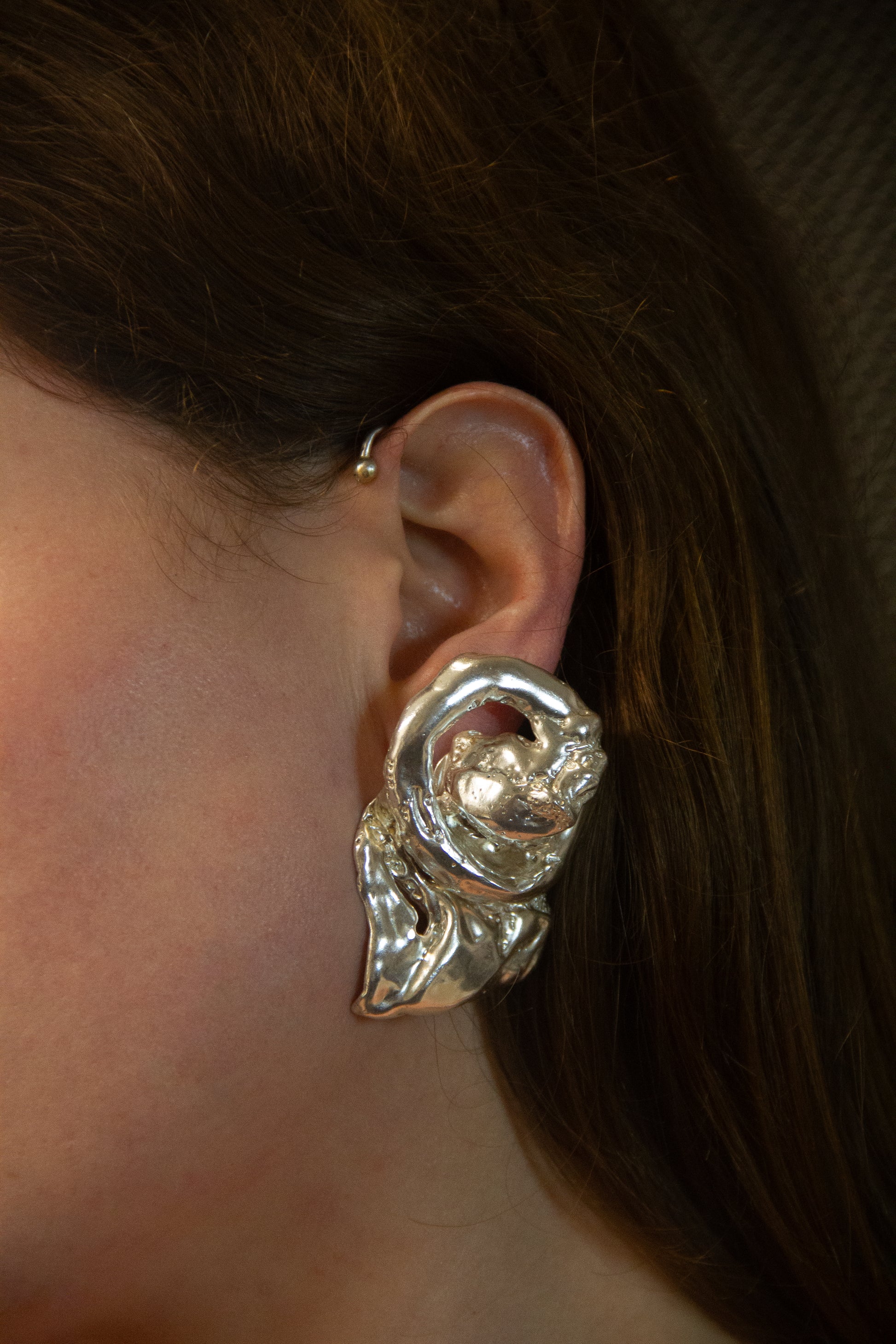 An ear piece in the shape of an abstracted swan form, neck curled and resting in nest.