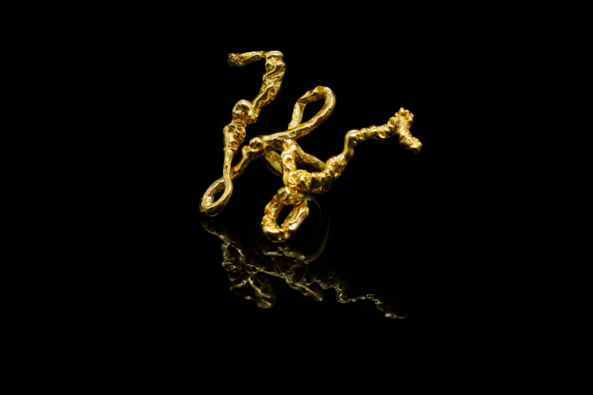 Freely formed material transmogrified into heavy metal, slipping between solid and liquid forms.