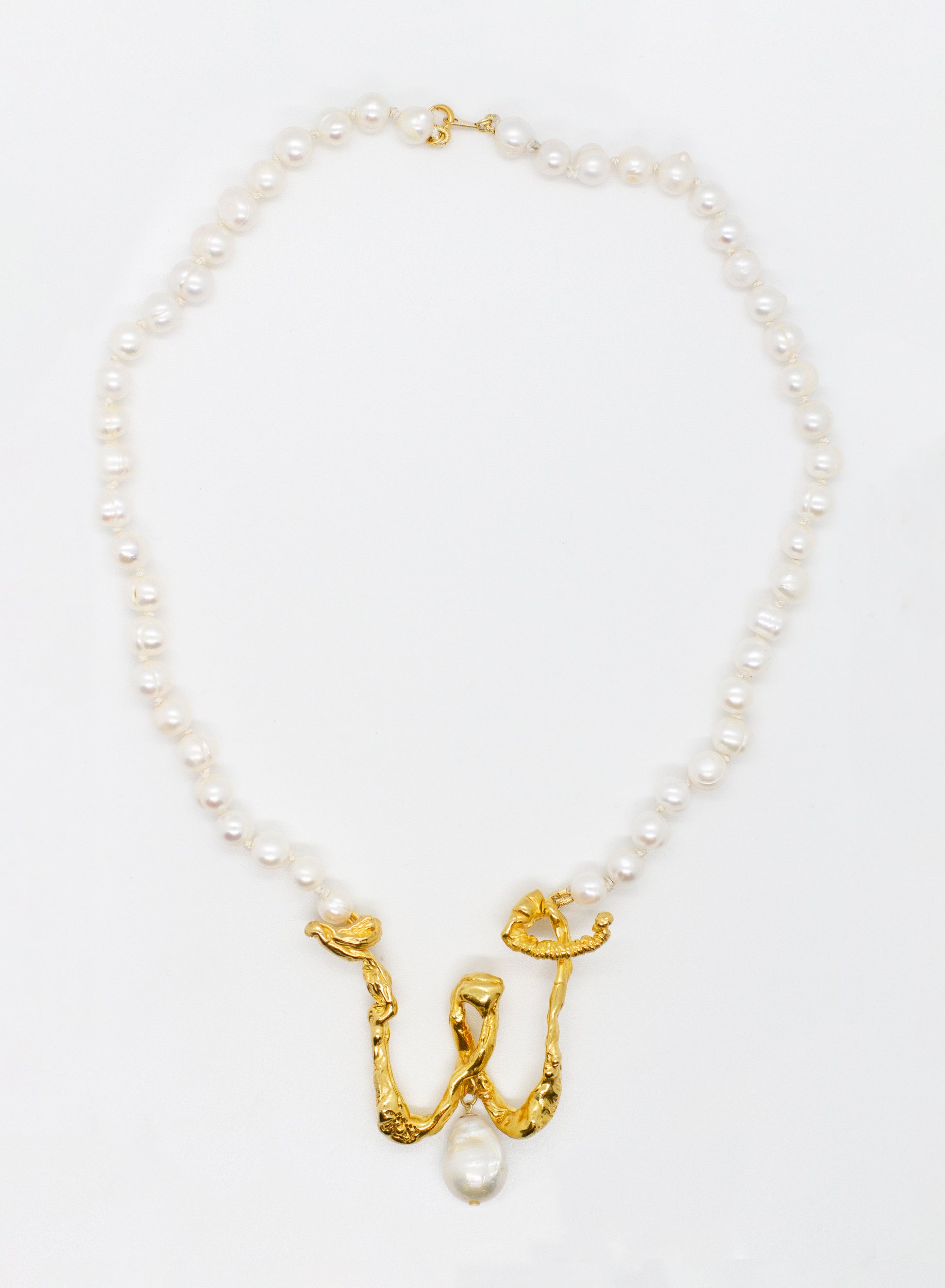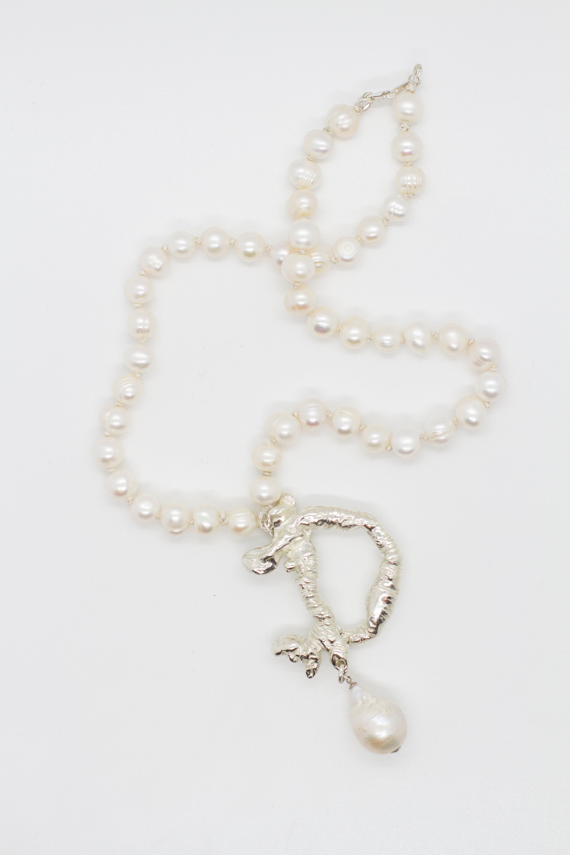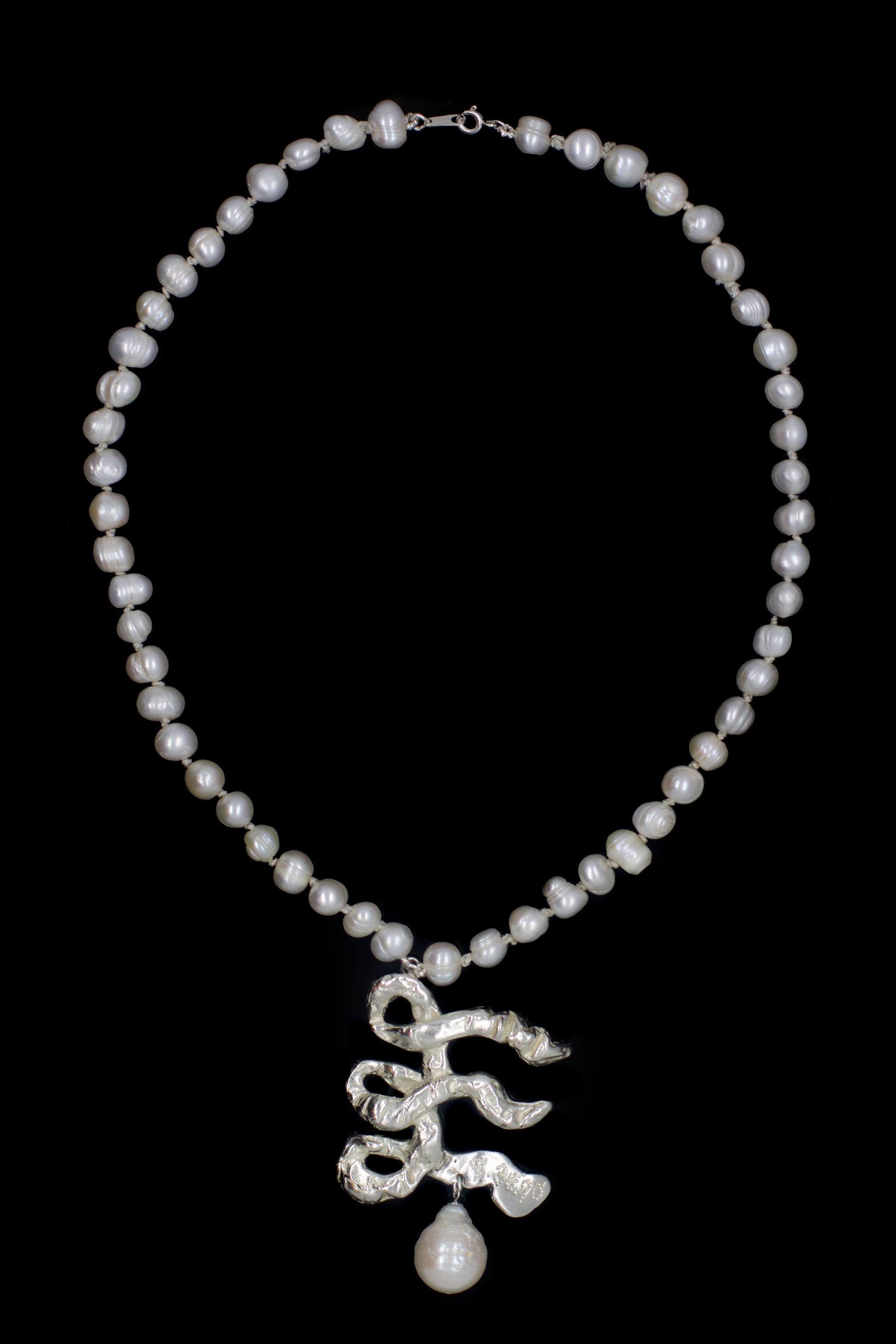 A bespoke chosen initial available as a uniquely sculpted pendant, strung on a cultured freshwater ringed pearl necklace knotted together with silk thread.