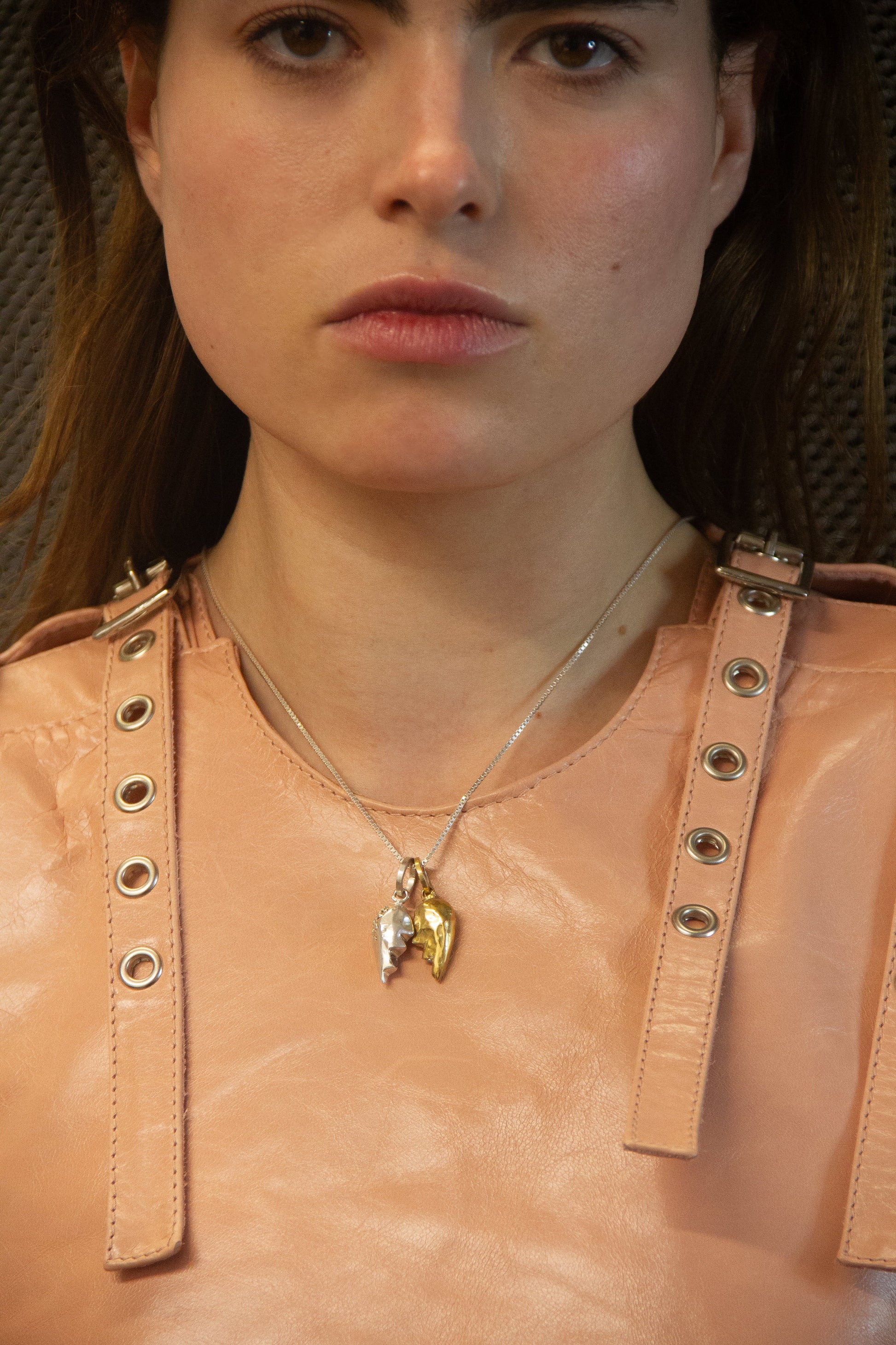 Solid metal pendants made to rest either on their own or alongside their other half.